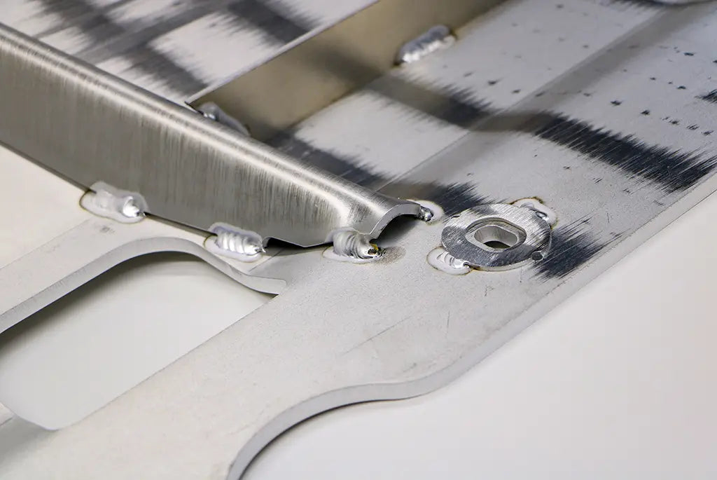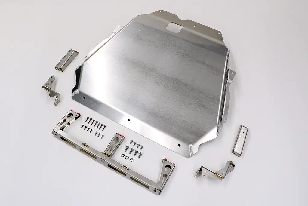 Ruostumattomasta teräksestä valmistetut kiinnikkeet yhdistävät suojalevyn alustaan alkuperäisissä kiinnityskohdissa. Porauksia ei tarvita.