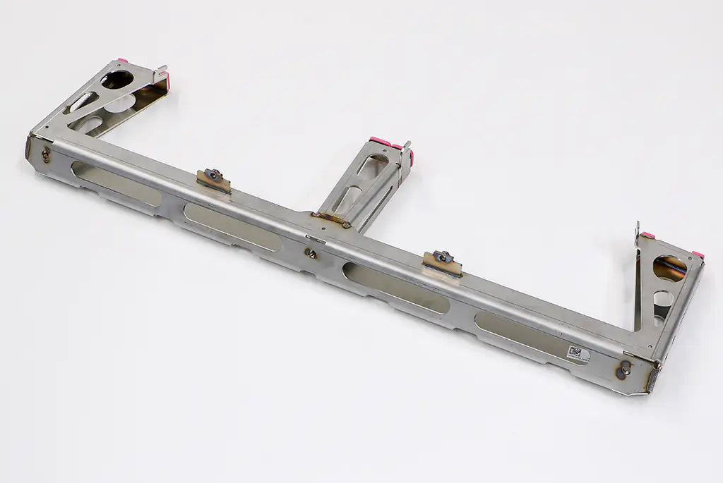 Erillinen tukipalkki jäähdytinkokoonpanon edessä mahdollistaa kiinnityksen korin puoleiseen törmäyselementtiin ja lisää suojalevyn rakenteellista lujuutta.